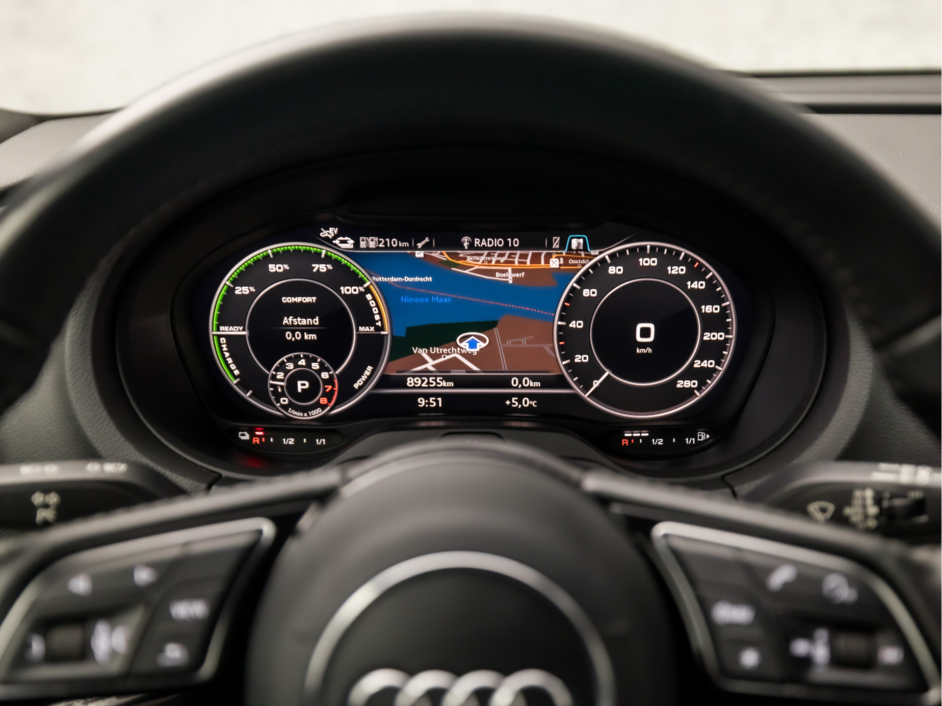 Rij- en route-info wordt perfect in beeld gebracht door het digitale dashboard. Adaptive cruise control houdt de ingestelde snelheid vast en houdt afstand tot het voertuig voor u. U kunt uw ogen op de weg houden, want het audio-installatiesysteem en het navigatiesysteem met harde schijf bedient u vanaf het stuurwiel. Radarsensoren aan de achterkant van de auto zorgen voor een achteropkomend verkeer waarschuwing als de afstand tot het verkeer achter te klein wordt. Automatische airconditioning regelt volautomatisch de temperatuur. U kiest de gewenste temperatuur en het systeem doet de rest. De uitrusting van deze Audi is met WIFI-hotspot, parkeersensoren voor en achter, regen- en lichtsensor, sportstuurwiel, keyless entry en isofix-aansluiting behoorlijk compleet.